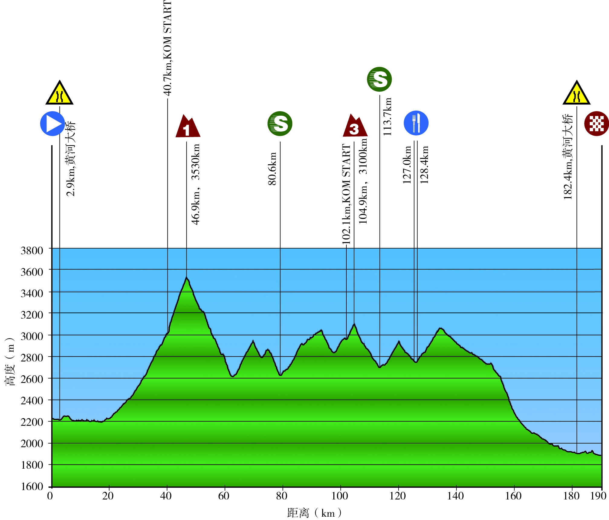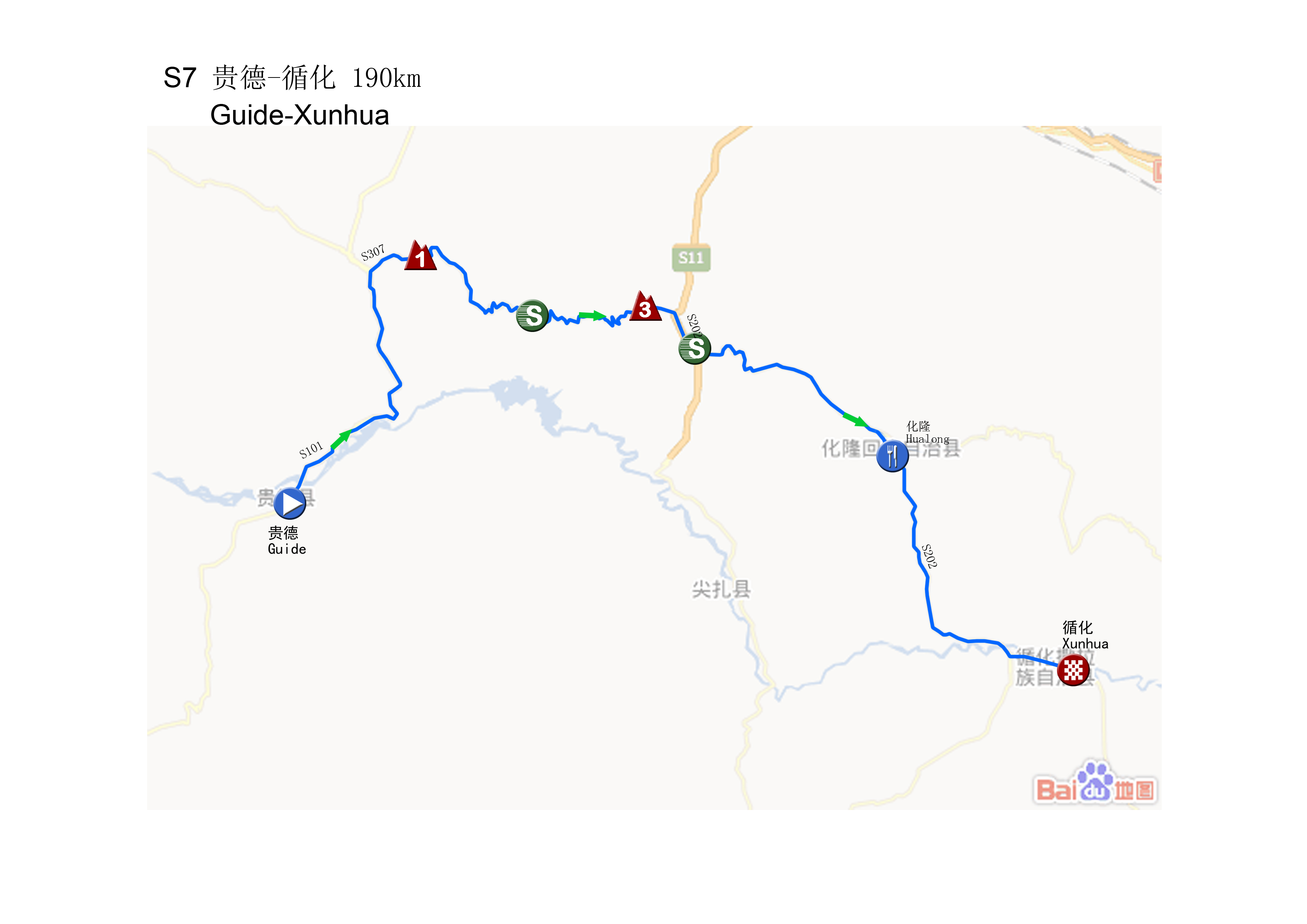 第七赛段贵德—循化,全长190公里,拥有一个1级爬坡(3530米)和一个3级爬坡点(3100米),分别位于第46.9公里以及第104.9公里处。而第80.6公里处的雄先乡以及第113.8公里处的扎巴则各设有一个途中冲刺点。