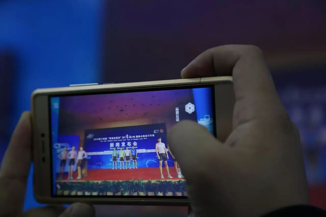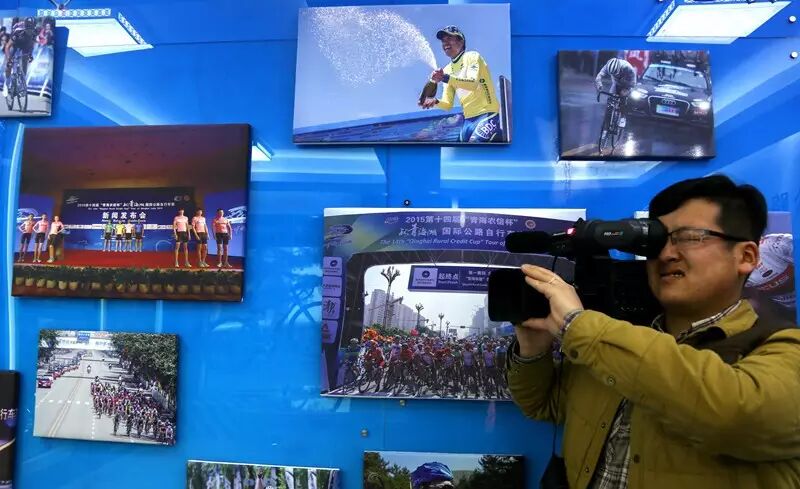 一名媒体记者在环湖赛展厅内采访、拍摄。